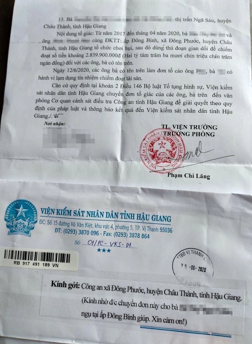Như PLO thông tin, VKSND tỉnh Hậu Giang đã chuyển cho Văn phòng cơ quan CSĐT Công an tỉnh này đơn tố giác của 15 hộ dân xã Đông Phước, huyện Châu Thành, về việc họ bị lạm dụng tín nhiệm chiếm đoạt nhiều tỉ đồng.