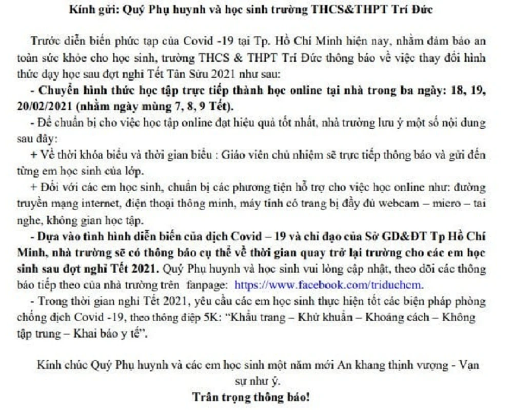 Trường THCS&THPT Trí Đức vừa gửi thông báo đến học sinh và phụ huynh học sinh về việc thay đổi hình thức dạy học sau đợt nghỉ Tết Tân Sửu 2021.