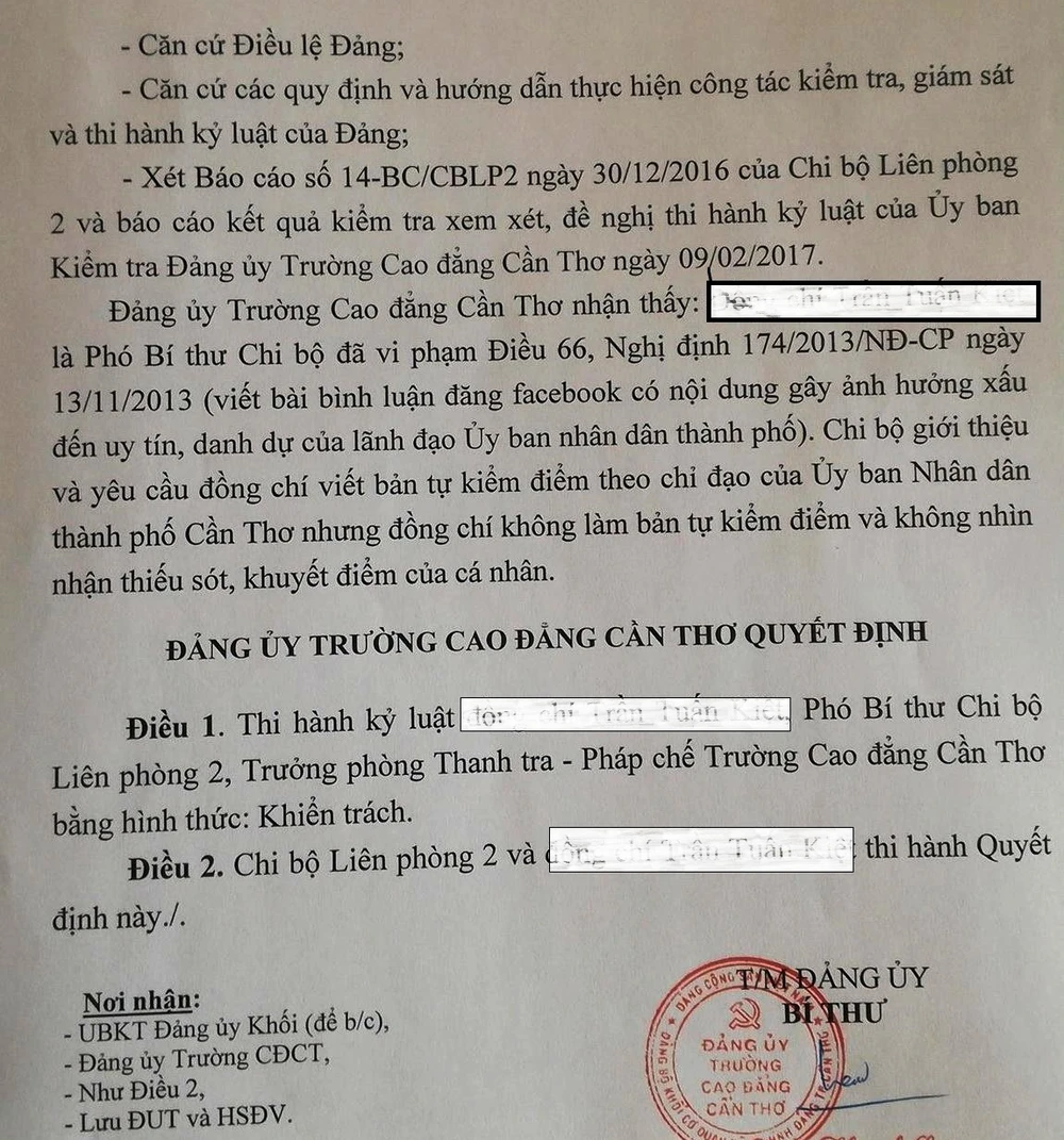 Lý do ông K bị kỷ luật được Đảng ủy Trường Cao đẳng Cần Thơ nêu trong quyết định là: ông T.T.K là phó bí thư chi bộ đã vi phạm Điều 66, Nghị định 174/2013 (viết bài bình luận đăng facebook có nội dung gây ảnh hưởng xấu đến uy tín, danh dự của lãnh đạo UBND thành phố); Chi bộ giới thiệu và yêu cầu ông K viết bản tự kiểm theo chỉ đạo của UBND TP Cần Thơ nhưng ông K không làm bản tự kiểm điểm và không nhận thiếu sót, khuyết điểm của cá nhân.