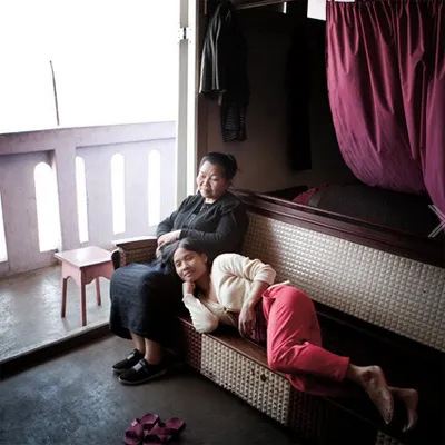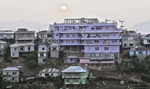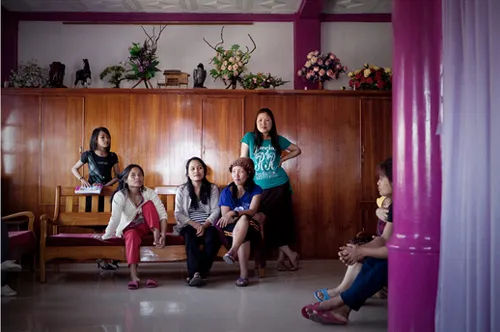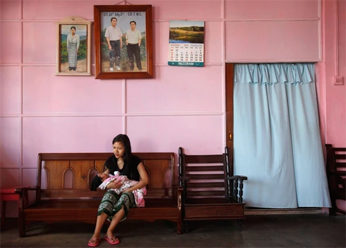 Hai người vợ Laltluangi (65 tuổi) và Thari (32 tuổi) xem phim bên hiên. Xung quanh ngôi nhà có một ban công kéo dài để phơi quần áo, làm lối lưu thông, ngồi chơi...