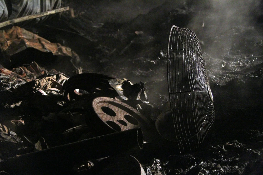 Theo quan sát, gần như toàn bộ khu xưởng đã bị thiêu rụi hoàn toàn, mái nhà của xưởng đổ xuống siêu vẹo, ngọn lửa còn cháy lan sang cả một góc vườn đào cạnh đó.