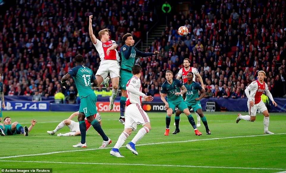 Ngay phút thứ 5 của trận đấu, chủ nhà Ajax đã dội ngay “gáo nước lạnh” vào các cầu thủ Tottenham bằng bàn thắng mở tỷ số. Xuất phát từ tình huống phạt góc, trung vệ trẻ đội trưởng của Ajax là De Ligt bật cao đánh đầu giúp đội nhà vươn lên dẫn trước 1-0. Trong bàn thắng này tiền vệ Van De Beek góp công không nhỏ khi cố tình quật ngã cầu thủ Tottenham để cho đồng đội mình thoải mái ghi bàn.