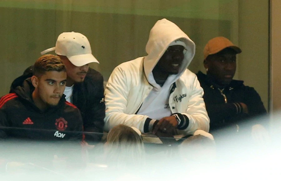 Paul Pogba (áo trùm đầu) xem MU đá Derby Country ở vòng 3 Carabao Cup