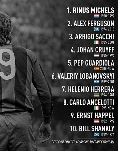 Với việc phát minh ra bóng đá tổng lực đưa “Cơn lốc màu da cam” trở thành thế lực của bóng đá thế giới, HLV người Hà Lan Rinus Michels được France Football đưa vào ngôi vị số 1, xếp trên huyền thoại MU Sir Alex Ferguson. Michels cũng là một trong những HLV hiếm hoi thành công ở CLB lẫn cấp đội đội tuyển Hà Lan.