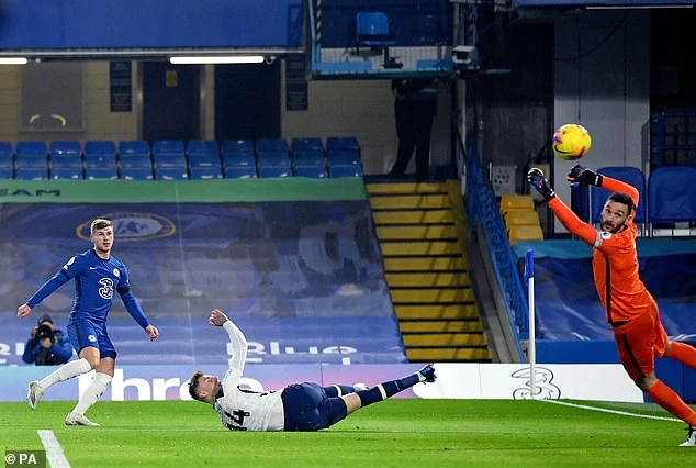 Werner sút tung lưới Tottenham nhưng bàn thắng không được công nhận vì lỗi việt vị. ẢNH: PA