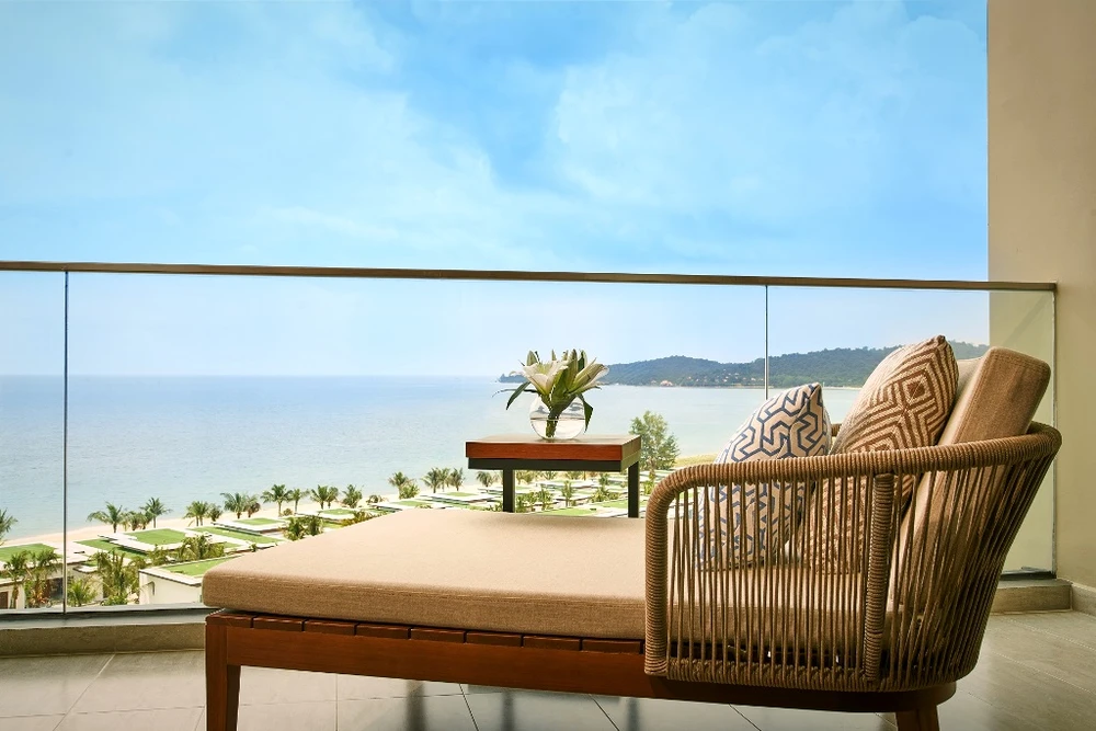 Từ ban công căn hộ khách sạn Mövenpick Resort Waverly Phú Quốc, du khách có thể phóng tầm mắt chiêm ngưỡng toàn bộ cảnh đẹp của bãi Ông Lang.