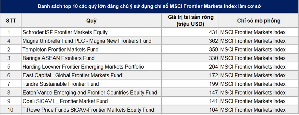 Ngoài ra, có rất nhiều quỹ chủ động khác đang sử dụng MSCI Frontier Markets Index làm chỉ số tham chiếu, điển hình là quỹ Schroder ISF Frontier Markets Equity (431 triệu USD), Magna Umbrella Fund PLC - Magna New Frontiers Fund (362 triệu USD), Templeton Frontier Markets Fund (359 triệu USD), Barings ASEAN Frontiers Fund (330 triệu USD)…