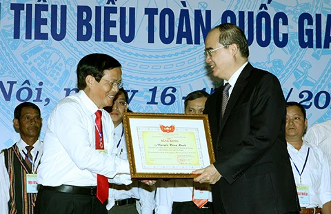 Chủ tịch Ủy ban Trung ương MTTQ Việt Nam Nguyễn Thiện Nhân trao tặng bằng khen cho ông Nguyễn Hùng Mạnh, Chủ tịch MTTQ Việt Nam phường An Dương (quận Lê Chân, TP Hải Phòng). Ảnh: TTXVN