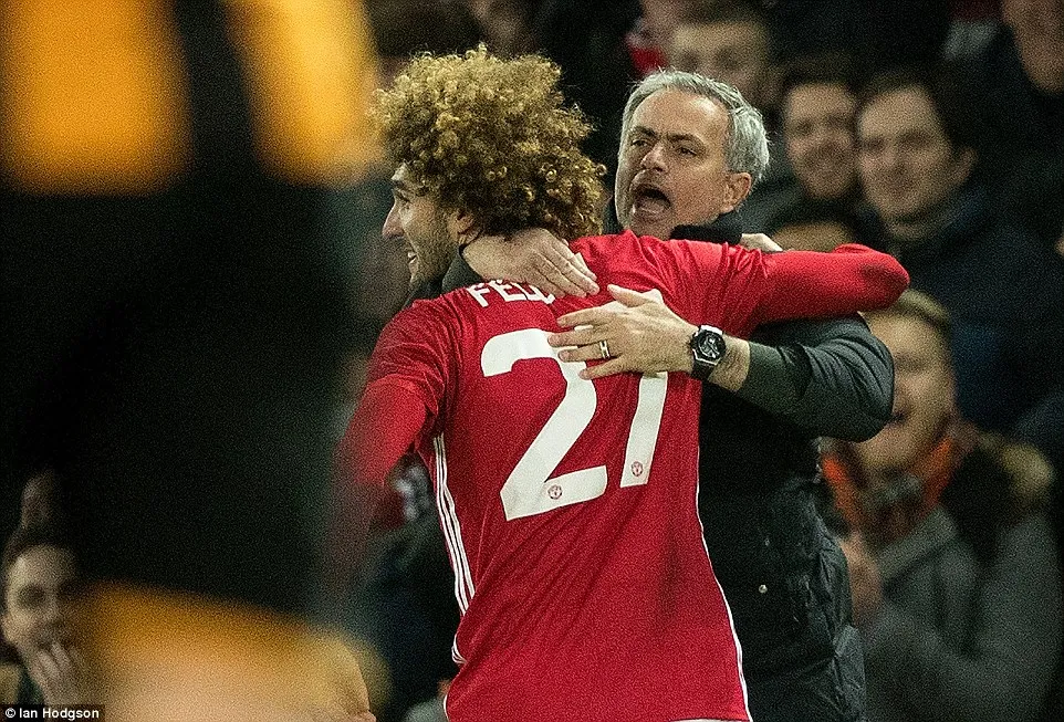 Sau khi ghi bàn, Fellaini đã không ngần ngại chạy đến khu vực kỹ thuật đội nhà ôm chầm lấy Mourinho.