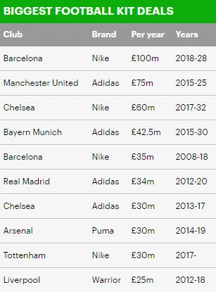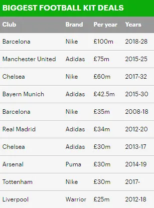Số tiền 30 triệu bảng/năm mà Nike trả cho Tottenham chẳng thấm là bao so với những đại gia khác. Barcelona chính là đội nhận được nhiều tiền nhất khi hãng Nike trả cho họ đến 100 triệu bảng/năm trong bản hợp đồng kéo dài đến 10 năm (2018-2028). Theo sau là Manchester United khi được hãng Adidas trả 75 triệu bảng Anh năm (2015-2025).