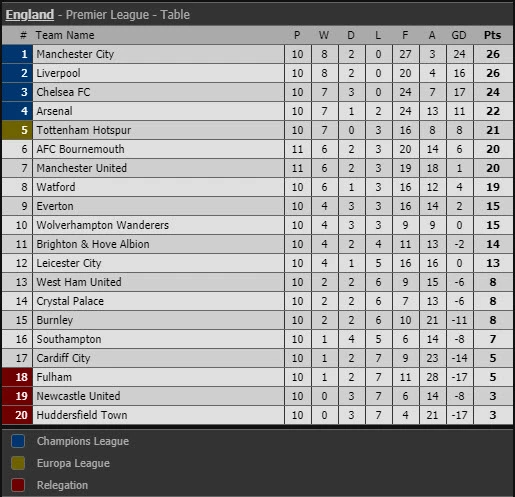 Chiến thắng nhọc nhằn trước Bournemouth, MU vươn lên vị trí thứ 7 trên bảng xếp hạng Premier League sau 11 vòng đấu. MU có cùng 20 điểm với chính Bournemouth nhưng xếp sau do kém hiệu số bàn thắng bại.