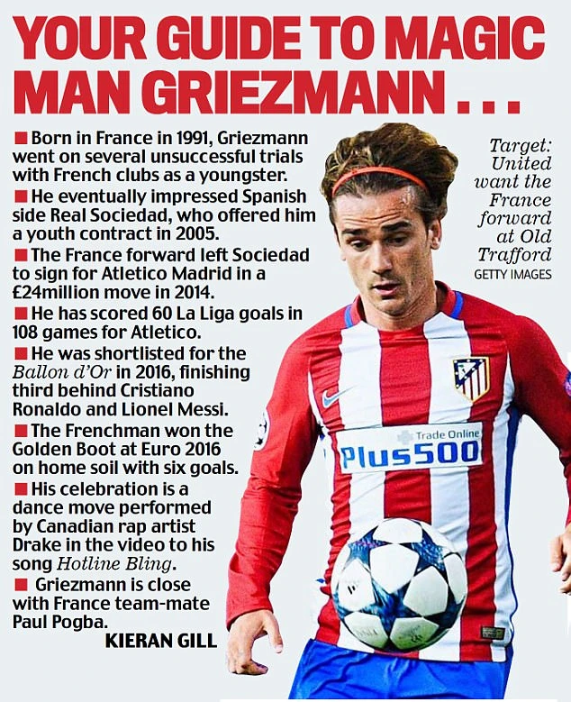 Tiền đạo 26 tuổi người Pháp của Atletico Madrid, Griezmann là mục tiêu chuyển nhượng hàng đầu của Man Utd và HLV Mourinho.