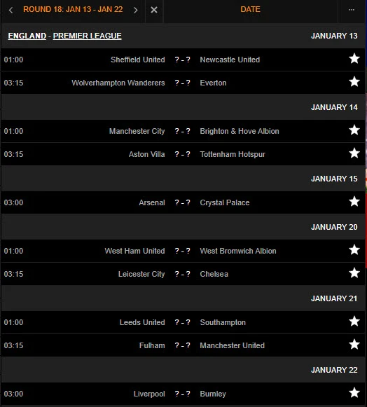 Vòng 18 và 19 Premier League diễn ra "ngược nhau". Nguồn: Livescore