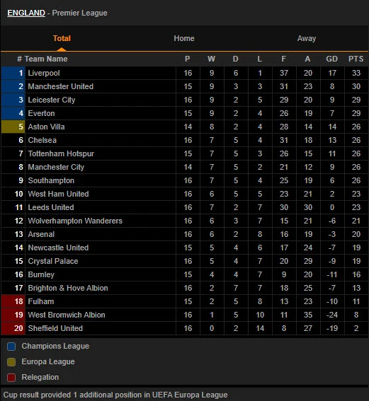 Trên bảng xếp hạng Premier League sau vòng 16, Liverpool đang dẫn đầu đầu với 33 điểm, MU đứng thứ hai có 30 điểm (đá ít hơn 1 trận).