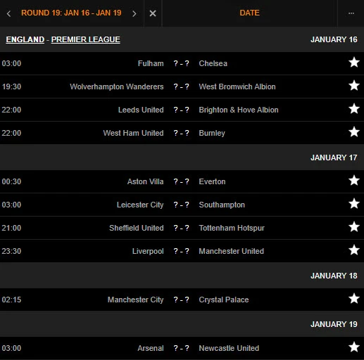 Điều đáng chú ý, theo cách sắp xếp lịch của Premier League thì vòng 19 lại diễn ra trước vòng 18. Theo đó, vòng 19 diễn ra theo khung thời gian từ 16 đến 19-1-2021, còn vòng 18 diễn ra từ 13 đến 22-1-2021 (tính cả các trận đấu bù).