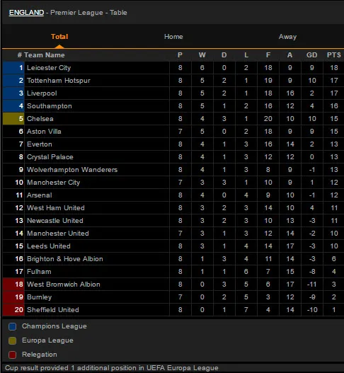 Bảng xếp hạng Premier League: