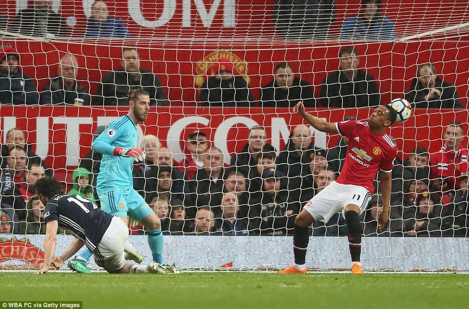 Trong hiệp 1, MU kiểm soát trận đấu nhưng họ gần như bất lực trong việc tìm đường khung thành đối phương. Chơi bế tắc, MU suýt trả giá ngay trong 45 phút đầu tiên của trận đấu nếu như De Gea không chơi xuất sắc trước những đợt phản công sắc bén của West Brom.