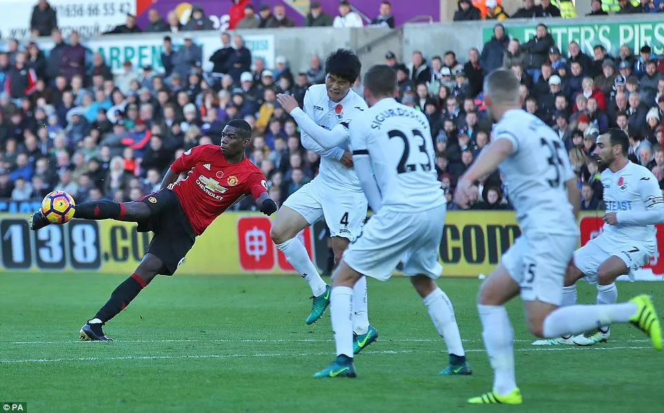Phút 15, Rooney có pha nhận bóng tinh tế rồi tạt vào trong, một hậu vệ Swansea đánh đầu phá bóng đến ngay tầm kiểm soát của Pogba, tiền vệ người Pháp tung ngay cú demi Volley sở trường tuyệt đẹp, bóng đi căng như kẻ chỉ khiến thủ thành Fabianski dù tung người hết cỡ nhưng không thể cứu thua. 1-0 cho MU.