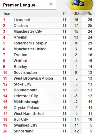 Bảng xếp hạng Premier League sau 11 vòng đấu: