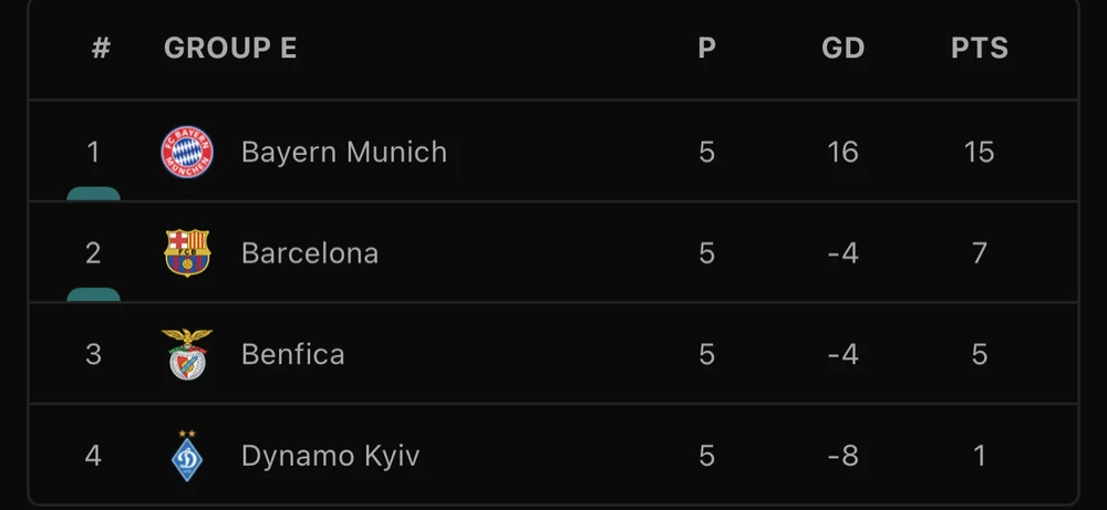 Với kết quả này, Bayern Munich giữ vững ngôi đầu bảng E với 15 điểm sau 5 trận toàn thắng, Barcelona xếp nhì bảng với 7 điểm sau khi hòa 0-0 với Benfica. Mặc dù đứng nhì bảng nhưng Barcelona vẫn không chắc suất đi tiếp, mà thầy trò HLV Xavi buộc phải giành chiến thắng ở lượt trận cuối khi đến làm khách trên sân của Bayern, bởi thời điểm hiện tại Benfica đang đứng vị trí thứ 3 với 5 điểm.