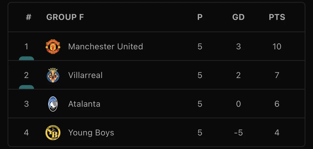 Với kết quả này, MU sớm đi tiếp vào vòng 16 đội khi đứng đầu bảng F với 10 điểm sau 5 vòng đấu, Villarreal đứng thứ hai với 7 điểm. Ở trận đấu còn lại, Young Boys hòa 3-3 với Atalanta và tấm vé còn lại của bảng F sẽ được định đoạt ở trận đấu cuối cùng giữa Atalanta và Villarreal.