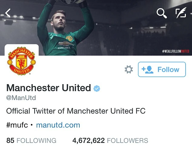Dù “vô địch” trên Facebook nhưng M.U chỉ giành vị trí thứ 3 trên Twitter. Bằng chứng là Quỷ đỏ chỉ có 4,61 triệu lượt theo dõi trên Twitter.