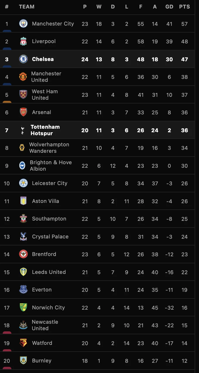Sau 23 vòng đấu ở Premier League, Manchester City vẫn vững vàng trên ngôi đầu bảng dù họ bị Southampton cầm hòa 1-1. Đội bóng của Pep Guardiola có 57 điểm, Liverpool đứng thứ 2 có 48 điểm nhưng đá ít hơn 1 trận. Chelsea vẫn ở vị trí thứ ba có 47 điểm, MU đứng thứ 4 có 38 điểm nhưng đá ít hơn Chelsea 2 trận.