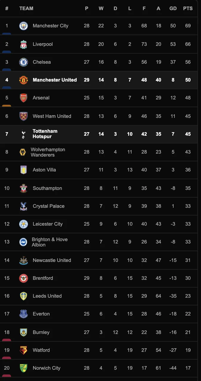Thắng Tottenham kịch tính 3-2, Manchester United trở lại Top 4 Premier League với 50 điểm, hơn đội xếp thứ 5 Arsenal 2 điểm nhưng “quỷ đỏ” đá nhiều hơn đến 4 trận. Tottenham vẫn dậm chân ở vị trí thứ 7 với 45 điểm, đá ít hơn MU 2 trận.