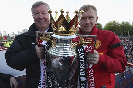 Scholes cùng Sir Alex bên chiếc cúp vô địch Premier League.