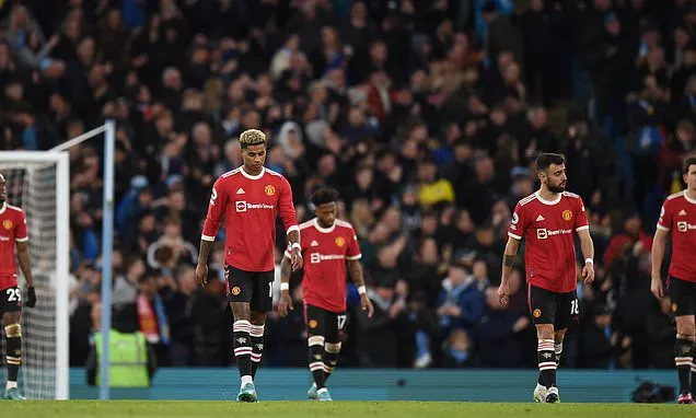 Các cầu thủ Man United đau khổ sau trận thua đau Man City 1-4 và rơi ra khỏi tốp bốn đội mạnh nhất Premier League. Ảnh: CGI.