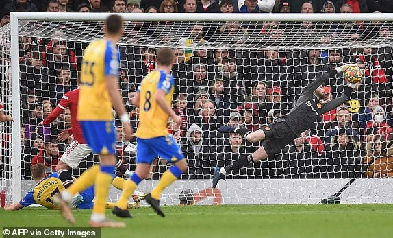 Đội khách Southampton tiếp tục khiến hàng thủ MU chao đảo với những pha lên bóng đầy tốc độ. Họ tạo ra liên tiếp hai cơ hội nguy hiểm, trong đó đáng kể nhất là pha Broja nỗ lực đi bóng rồi dứt điểm bất chấp bị Luke Shaw kéo áo lộ liễu, thủ môn De Gea đã xuất sắc bay người đẩy bóng ra.