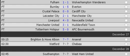 Trong khi MU thăng hoa bao nhiêu thì Man City lại gây thất vọng bấy nhiêu. Thầy trò HLV Pep Guardiola tiếp tục chuỗi trận tệ hại khi thua Leicester City 1-2. Trận thua này càng tai hại khi Liverpool dễ dàng đánh bại Newcastle 4-0 trong trận đấu cùng giờ. Trong khi đó, Tottenham cũng thắng đậm Bournemouth 5-0.