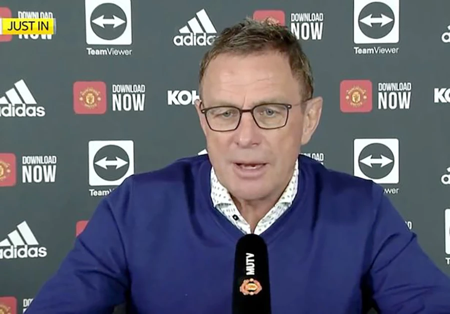 Rangnick trong buổi họp báo của Man Utd. ẢNH: MIRROR