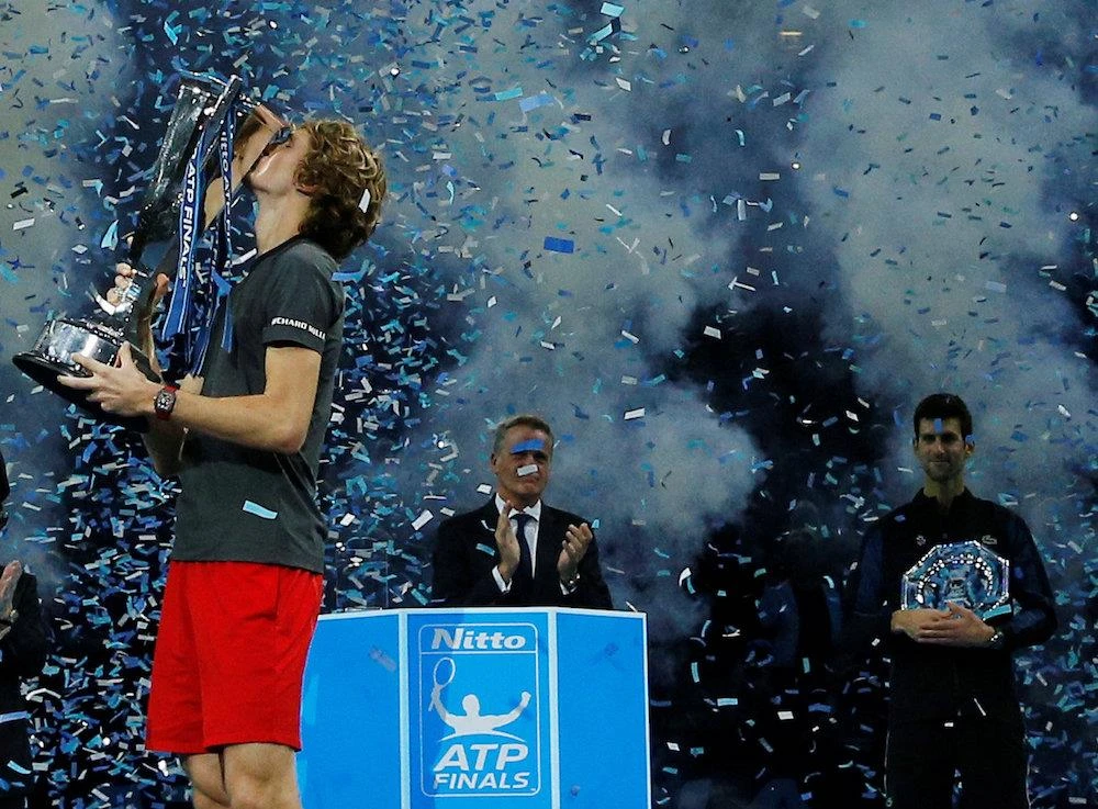 Tay vợt người Đức Zverev nâng cúp vô địch ATP Finals 2018 sau chiến thắng đánh bại Djokovic. Ảnh: AP