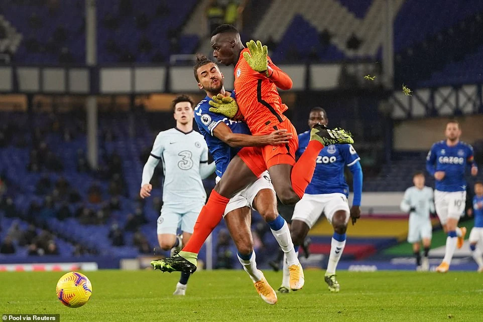Pha băng ra lỡ đà của Mendy đã khiến anh lao vào Calvert-Lewin và ngay lập tức ngôi sao mới nổi của tuyển Anh ngã lăn ra sân. Một pha phạm lỗi rõ ràng dù Mendy có thể không cố ý phạm lỗi nhưng chừng đó cũng đủ khiến Chelsea ôm hận.