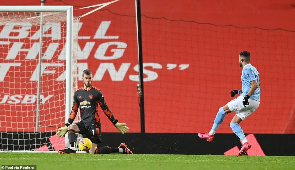 Mahrez đối mặt thủ môn De Gea nhưng không thể ghi bàn. ẢNH: REUTERS