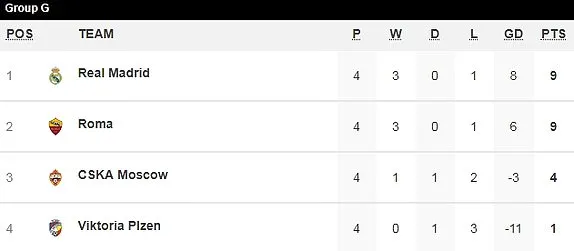 Việc cả Real Madrid và AS Roma đều giành được chiến thắng ở lượt trận thứ tư, giúp cho đội bóng hoàng gia và “ ông lớn” của Serie A vươn lên hai vị trí đầu bảng G với cùng 9 điểm. Mặc dù có cùng điểm số nhưng Real Madrid là đội đứng đầu bảng vì hơn AS Roma nhờ hiệu số bàn thắng.