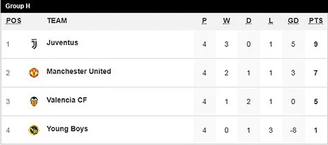 Với trận thua đầy ấm ức trước Man United trên sân nhà, Juventus vẫn giữ được vị trí đầu bảng sau bốn lướt trận với 9 điểm. Còn Man United may mắn vươn lên vị trí thứ hai với 7 điểm.