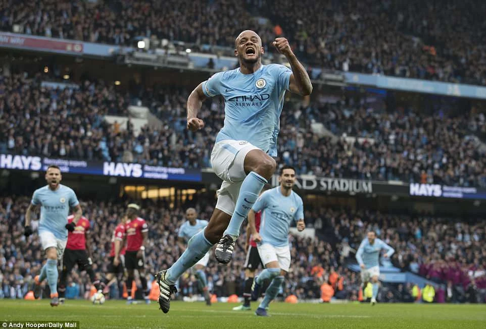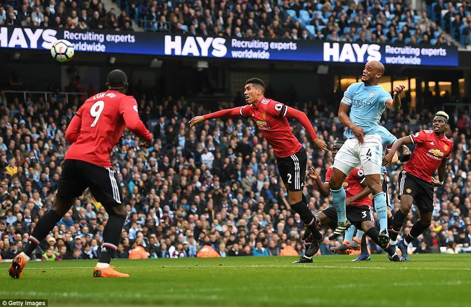 Trong hiệp 1, MU bị Man City ép sân toàn diện và gần như vỡ trận. Thầy trò Mourinho thua hai bàn chóng vánh chỉ sau nửa giờ thi đấu. Phút 25, từ quả đá phạt góc của Sane, Kompany băng vào đánh đầu dũng mãnh tung nóc lưới De Gea mở tỉ số 1-0 cho Man City.