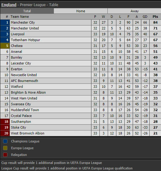 Bảng xếp hạng Premier League: