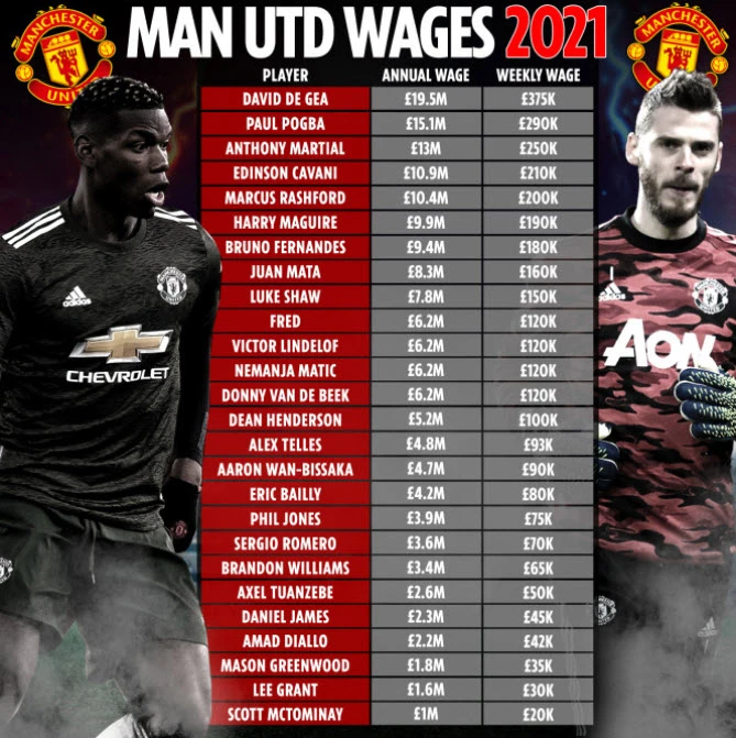 De Gea hiện nhận mức lương cao nhất MU với 375.000 bảng Anh/tuần, theo sau là Pogba hơn 290.000 bảng Anh/tuần, Antony Martial cũng nhận lương 290.000 bảng Anh/tuần. Những cầu thủ xếp trên Bruno còn có Endison Cavani, Marcus Rashford và đội trưởng Harry Maguire.