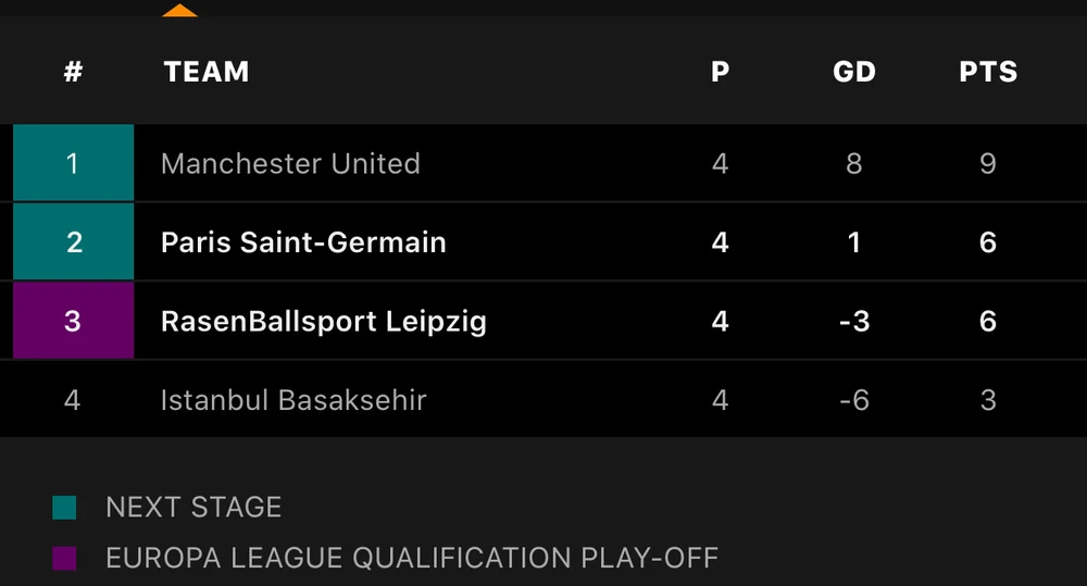 Thắng tưng bừng Istanbul Basaksehir, Man. United leo lên ngôi đầu bảng H với 9 điểm sau 4 vòng đấu. Ở trận đấu còn lại của bảng H, Paris Saint Germain giành chiến thắng tối thiểu 1-0 trước Leipzig với bàn thắng trên chấm 11m của Neymar. Bàn thắng này giúp PSG có được vị trí nhì bảng với 6 điểm, cùng điểm số với Leipzig nhưng xếp trên do hơn hiệu số bàn thắng.