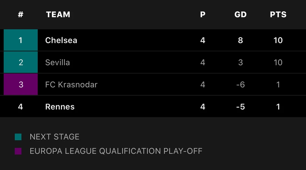 Cả Chelsea lẫn Sevilla đều giành vé sớm vào vòng knock-out trước hai lượt trận, bởi hai đội xếp sau Rennes và Krasnodar mới chỉ có 1 điểm.