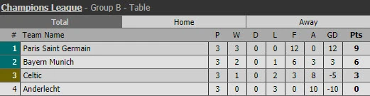 Trận còn lại, Bayern Munich thắng dễ Celtic 3-0 trên sân nhà nhờ các bàn thắng của Muller, Kimmich và Hummels. Với kết quả này, PSG tiếp tục dẫn đầu bảng với 9 điểm, Bayern thứ hai có 6 điểm, Celtic có 3 điểm xếp thứ ba còn Anderlecht xếp cuối chưa có điểm nào.