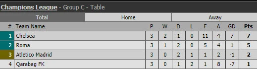 Trận còn lại, sự chủ quan của Chelsea suýt chút nữa khiến họ ôm hận trước Roma trên sân nhà Stamford Bridge. Sớm vượt lên dẫn trước đối thủ 2-0 nhờ hai bàn thắng của David Luiz và Eden Hazard nhưng sau đó Chelsea bất ngờ bị Roma chọc thủng lưới ba lần liền.