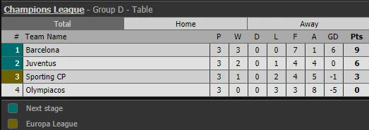 Hiện tại ở bảng này, Barcelona vẫn dẫn đầu với 9 điểm tuyệt đối, Juventus có 6 điểm đứng thứ hai, Sporting có 3 điểm còn Olympiacos chưa có điểm nào.