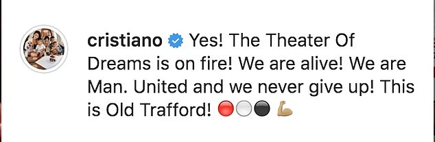 Bên cạnh bức ảnh của trận đấu, Ronaldo viết: “Vâng! Nhà hát của những giấc mơ đang cháy! Chúng tôi đang sống. Chúng tôi là Manchester United và chúng tôi không bao giờ bỏ cuộc. Đây là Old Trafford!”.
