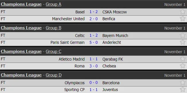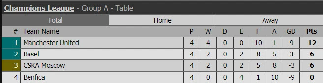 Ở trận đấu còn lại, Basel thua 1-2 ngay trên sân nhà trước CSKA Moscow. Kết quả này khiến Basel bị CSKA Moscow bắt kịp trên bảng xếp hạng khi cả hai có cùng 6 điểm. MU dẫn đầu với 12 điểm tuyệt đối còn Benfica xếp cuối chưa có điểm nào.