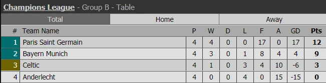 Với kết quả này, PSG đã chính thức giành chiếc vé đầu tiên của bảng dự vòng knock-out, trong khi chiếc vé còn lại cũng khó thoát khỏi tay Bayern Munich. Hiện PSG dẫn đầu bảng với 12 điểm tuyệt đối, Bayern Munich đứng thứ hai với 9 điểm, Celtic 3 điểm đứng thứ ba còn Anderlect chưa có điểm nào xếp cuối.