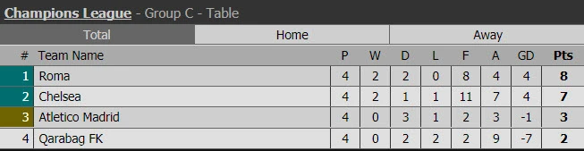 Tuy thua trận, Chelsea vẫn có cửa lớn lọt vào vòng knock-out bởi Atletico thi đấu quá tệ. Hiện Roma dẫn đầu bảng với 8 điểm, Chelsea xếp thứ hai với 7 điểm, Atletico có 3 điểm còn Qarabag FK được 2 điểm.